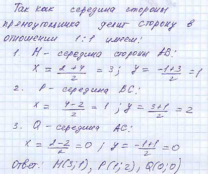 Задача 28Задача 28. Определить середины сторон треугольника с вершинами A(2; 1), B(4; 3), C(-2; 1)