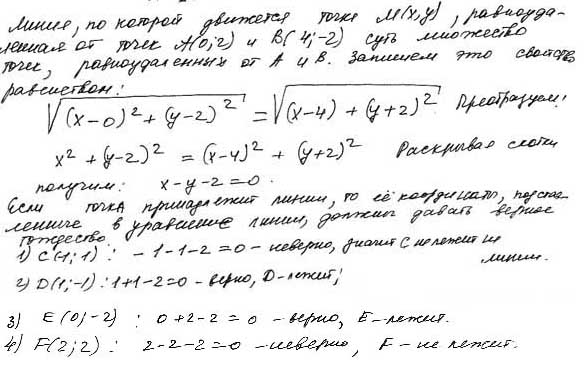 Задача 43Задача 43. Написать уравнение линии, по которой движется точка M(x; y), равноудаленная от точек A(0; 2) и B(4; -2). Лежат ли на этой линии точки C(-1; 1), D(1; -1), E(0; -2) и F(2; 2)? :: Рекомендуемая литература. Посетите интернет-магазины: , VIP Казань — Казань для достойных людей