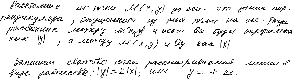 Задача 49Задача 49. Написать уравнение линии, по которой движется точка M(x; y), оставаясь вдвое дальше от оси Ox, чем от оси Oy.